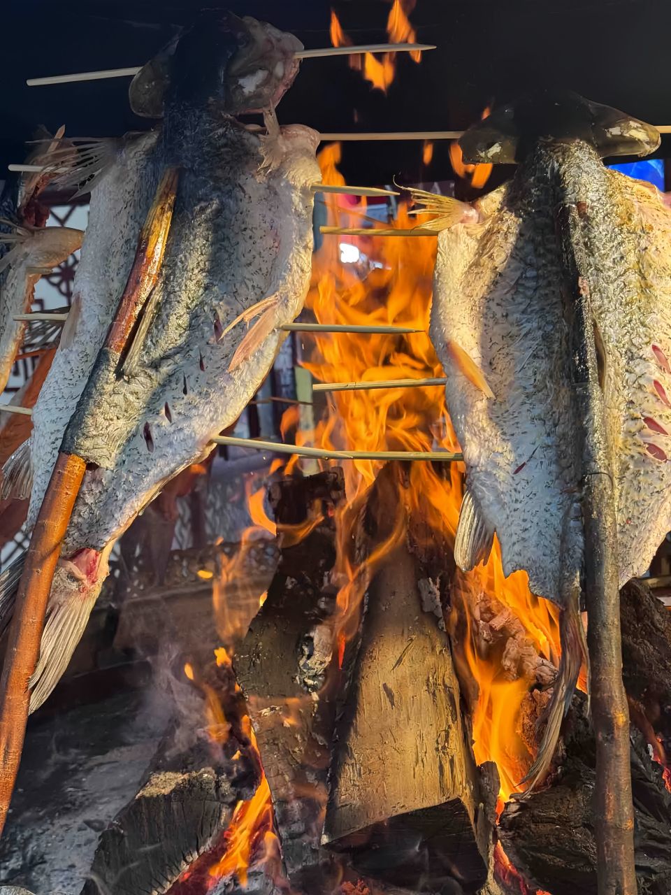 • 烤鱼在火上滋滋作响,香气扑鼻,一定很好吃!